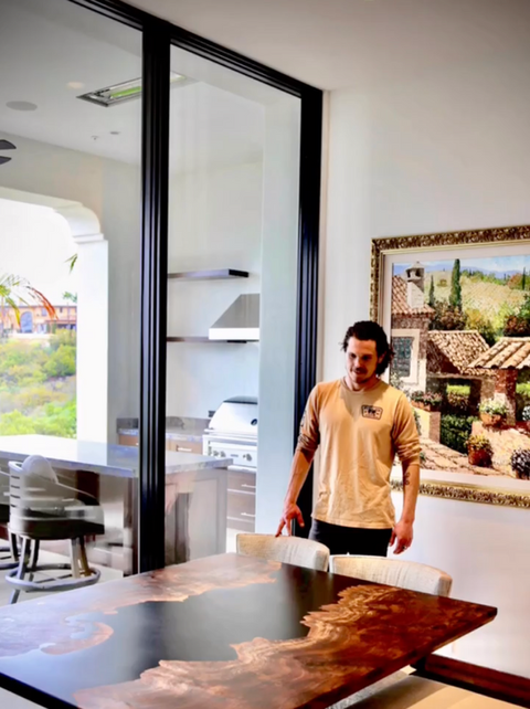 Every creation is a blend of artistry and sustainability. We only use Ecopoxy resin, a bio-based epoxy that is non-toxic, containing 0% VOC’s, and is biodegradable. A species of wood and a color of resin that compliment the design. C-Channels are routed into the bottom of your table, keeping it flat through seasonal changes in temperature and humidity.